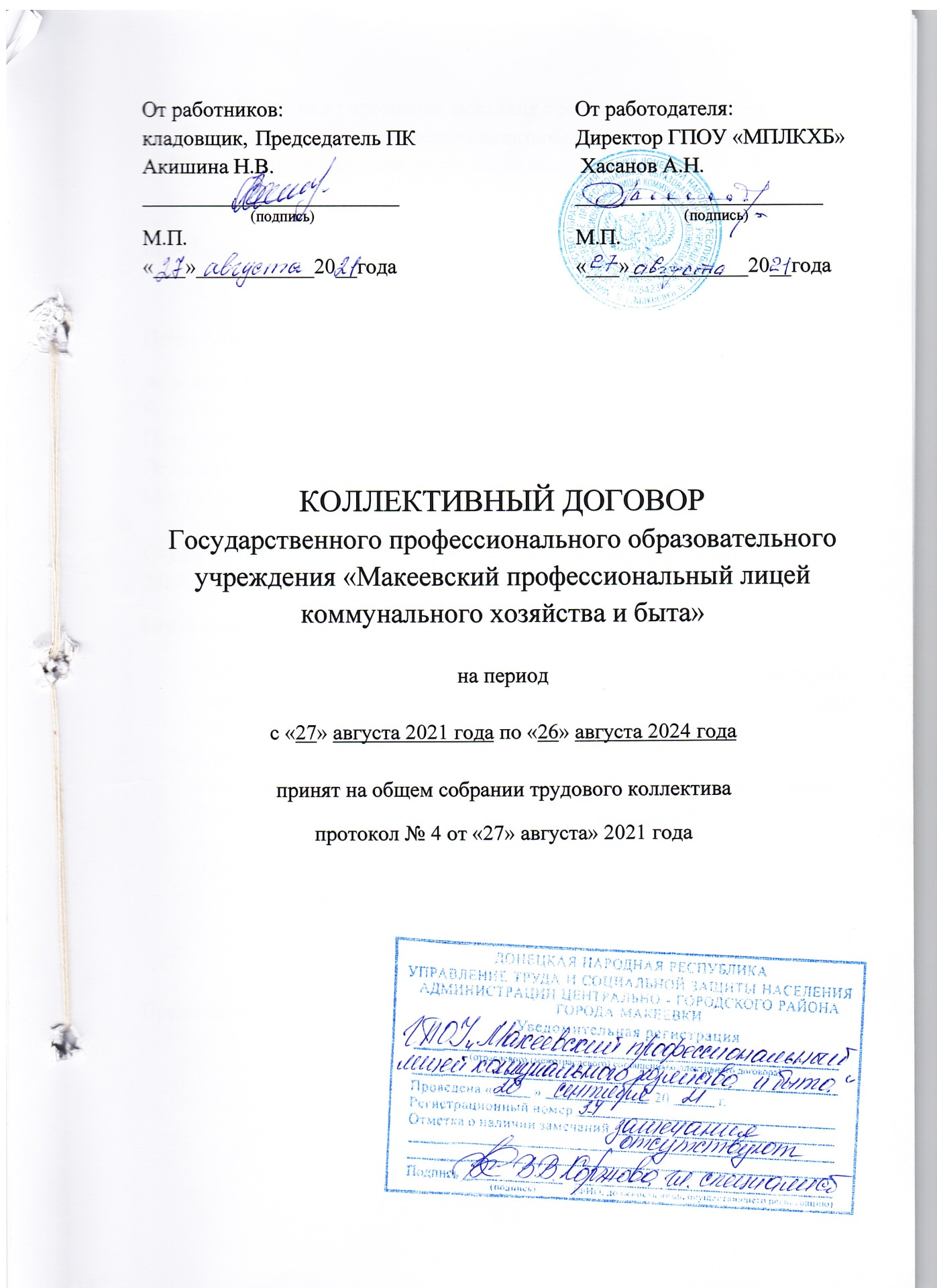 Договор заключен между работодателем ГОСУДАРСТВЕННОГО ПРОФЕССИОНАЛЬНОГО ОБРАЗОВАТЕЛЬНОГО УЧРЕЖДЕНИЯ «МАКЕЕВСКИЙ ПРОФЕССИОНАЛЬНЫЙ ЛИЦЕЙ КОММУНАЛЬНОГО ХОЗЯЙСТВА И БЫТА» в лице директора Хасанова Анвара Нургалиевича, с одной стороны (далее – сторона работодателя) и профсоюзным комитетом первичной профсоюзной организации Профсоюза работников образования и науки Донецкой Народной Республики от имени трудового коллектива, с другой стороны (далее – профсоюзная сторона).